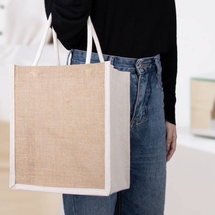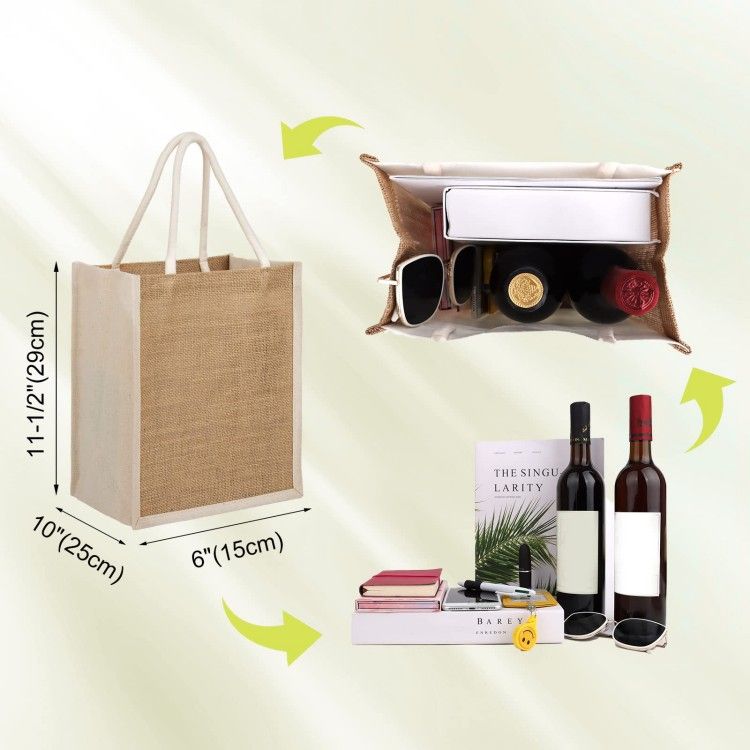Material: Natural burlap front & back and canvas cotton sides, sewn with cotton rope handle for confortable carrying; durable, affordable and waterproof. PVC film lined interior.