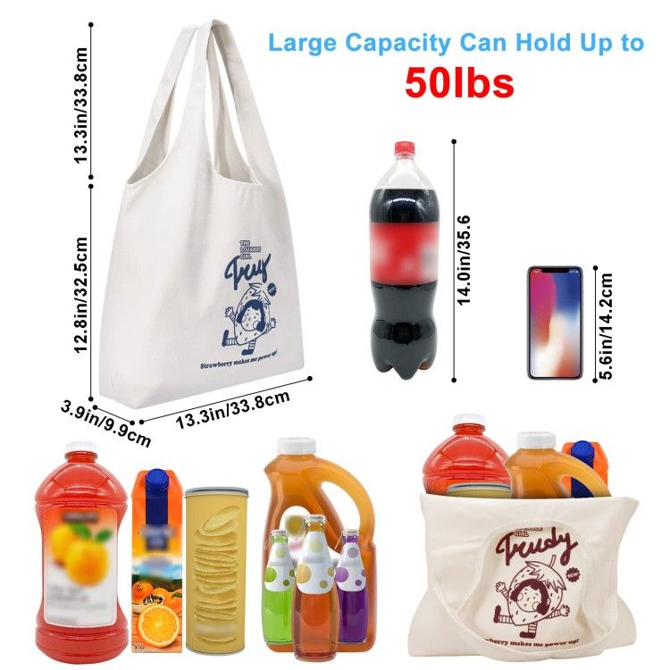 X-Large capacity: Canvas tote bags are very big which can hold up to 50+ pounds of groceries and replaces 2-3 conventional grocery bags. Long handles of the reusable foldable shopping bags allow for hand holding or carry on the shoulder for easier carrying, perfect reusable grocery bags for shopping, groceries, travel, storage and practical for daily use.