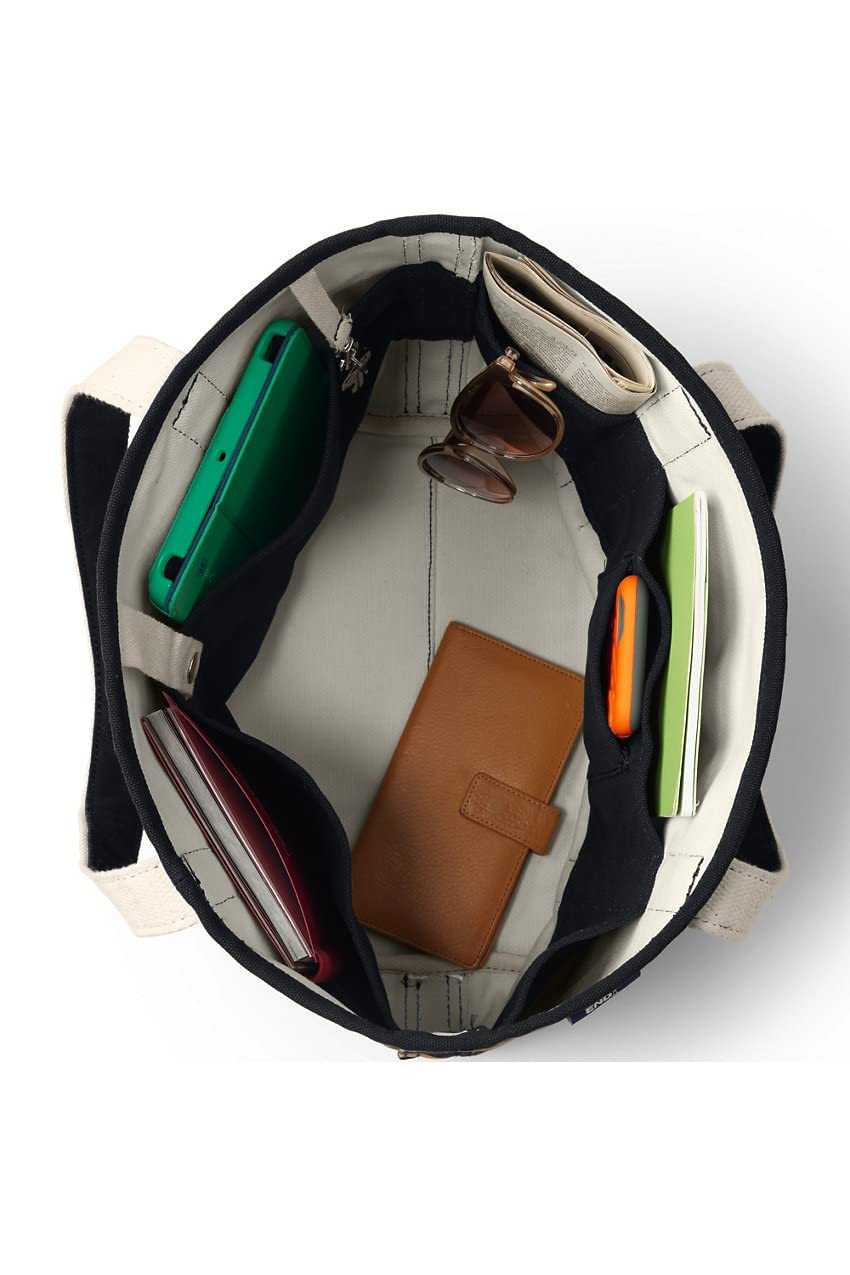 Wide felled seams allow it to stand upright, keeping contents inside Water-repellent base and trim Outside pocket, plus four interior pockets and key ring attachment for organization      Size: 13"Wx5½"Dx9"H; bottom 8½"W; handle drop 4½"