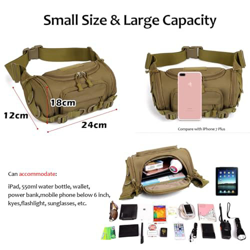 · ⭐ Multi-pocket STRUCTURE -- 1 x zipped main pocket, 1 x front zipped pocket, 2 x side zipped pocket, 1 x back zipped pocket, 1 x zipped inner pocket, this military waist bag can help keep your things inside organized and easy to reach.