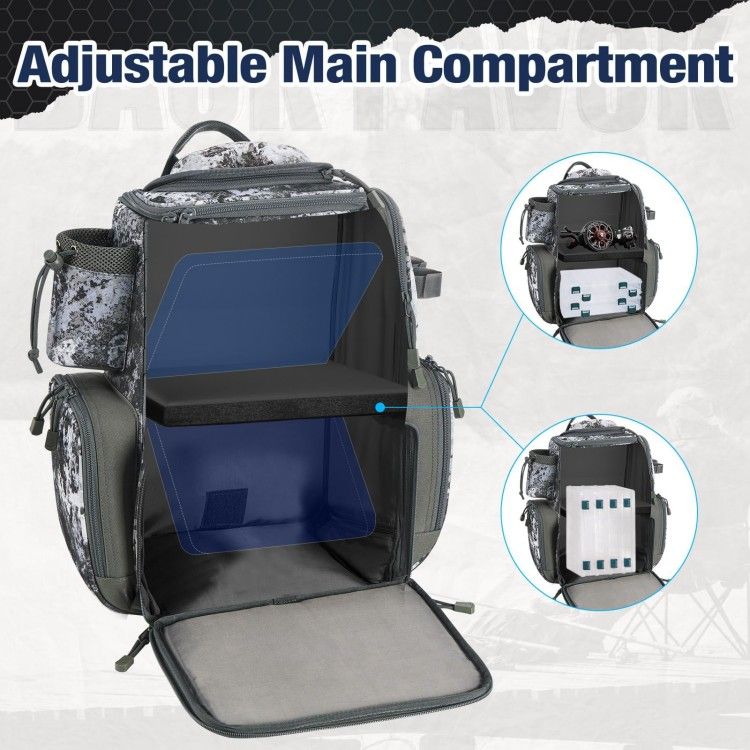· Adjustable Main Compartment: There is a removable clapboard in the main bag. You will get 17.7'' X 12.6'' X 7.9'' room for the big size fishing gears by removing the clapboard. Installing the clapboard to have two equally separated rooms for more effective use with different stuff