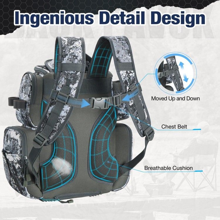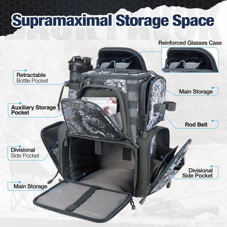 · Exquisite 86 Sewing Procedures: The Fishing Tackle Backpack is made from superior high quality water-resistant 1200D high density nylon fabrics, paired with resilient KAM buckle and SBS zippers. The precise 86 sewing procedures offer 20% higher water resistance and toughness